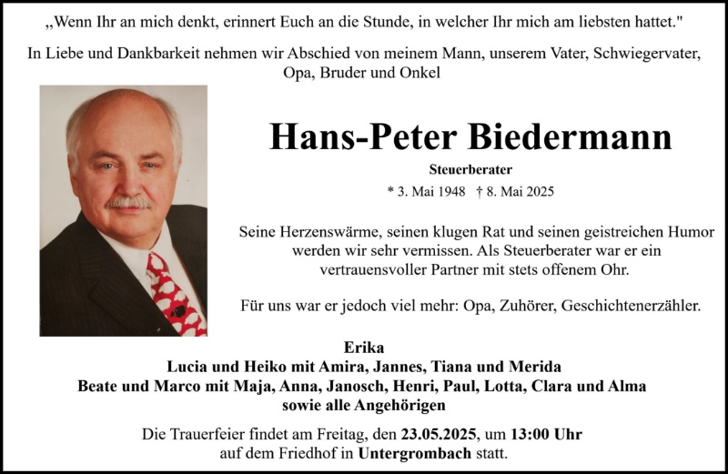 in diesen Tagen fühlen wir mit Ihnen und wünschen Ihnen von Herzen, dass Sie aus den glücklichen Erinnerungen Kraft schöpfen, um positiv in die Zukunft zu gehen. Diese Gedenkseite möge Ihnen dabei helfen, Ihre Trauer zu teilen und das Andenken gemeinsam wachzuhalten.