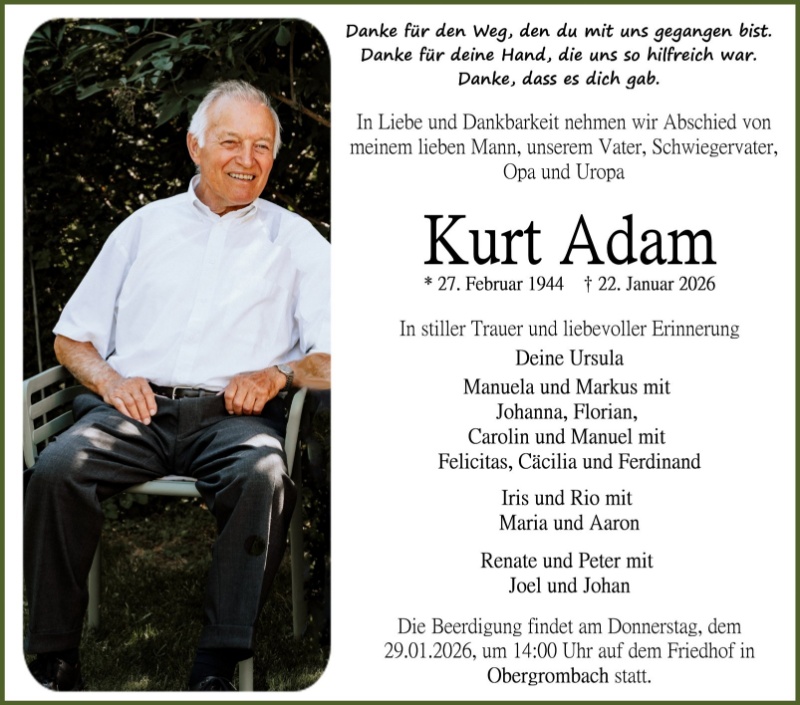 in diesen Tagen fühlen wir mit Ihnen und wünschen Ihnen von Herzen, dass Sie aus den glücklichen Erinnerungen Kraft schöpfen, um positiv in die Zukunft zu gehen. Diese Gedenkseite möge Ihnen dabei helfen, Ihre Trauer zu teilen und das Andenken gemeinsam wachzuhalten.